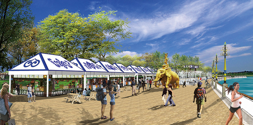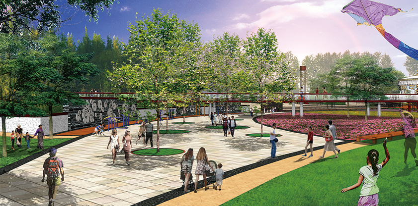 “高原新藝”緊鄰未來的城市商業(yè)中心,整體規(guī)劃中更著重于商業(yè)休閑綠地的營造,在景觀設(shè)計(jì)中體現(xiàn)了城市河道對(duì)城市休閑提空間的價(jià)值,以更加親人的尺度打造濱水步行景觀空間,以藏族傳統(tǒng)藝術(shù)體驗(yàn)為主,開展藏戲演出、藏餐、工藝品制作等休閑項(xiàng)目,通過閘橋、碼頭與對(duì)岸緊密相連,使商業(yè)地塊與公園能夠相結(jié)合,共同作用,凝聚更多更豐富的人文活動(dòng)。