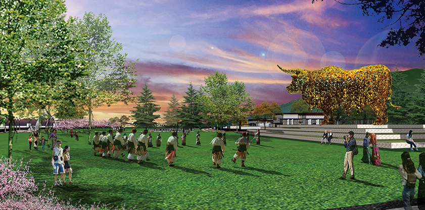 “圣地福谷”與雪域瓊島隔水相望,共同位于以布達(dá)拉宮為中心的拉薩景觀軸線上,佛光普照、神圣祥和。該地塊與南部次角林文化旅游度假區(qū)相連,是文化旅游產(chǎn)業(yè)向水邊的延伸,在區(qū)域內(nèi)引入水系,形成內(nèi)湖,湖心設(shè)置大型的格薩爾王雕塑廣場,利用其周邊場地和水面,開展文化演出活動(dòng)。并設(shè)計(jì)內(nèi)外聯(lián)動(dòng)的文化長廊,配合文化展示和民俗傳統(tǒng)展示。