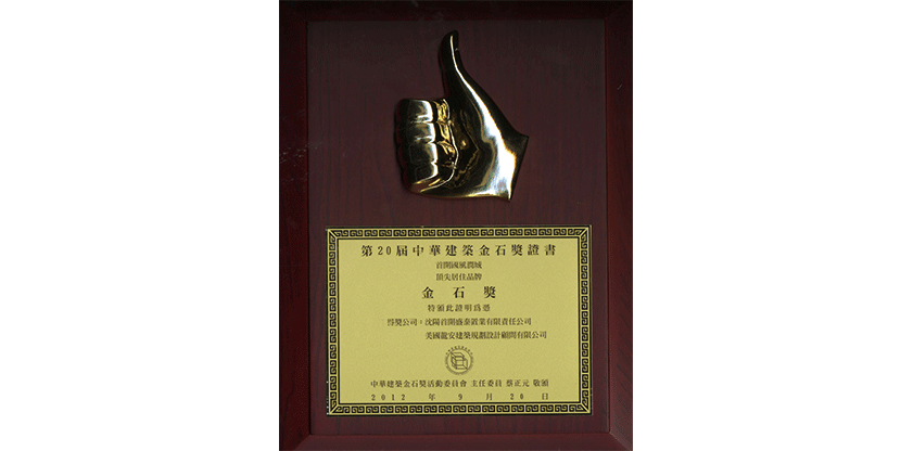 獲獎情況:2012年榮獲臺灣第20屆中華建筑金石獎活動“頂尖居住品牌金石獎”。