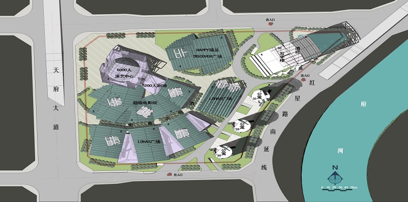 根據(jù)周邊交通及自然條件,基地具有西側(cè)交通便利、東側(cè)擁有可利用自然資源的特征。沿天府大道一側(cè)布置人流密集、需要便捷交通的大型演藝中心及劇場,使之成為有活力、富于特色的標(biāo)志性城市建筑。而將超星級酒店、寫字樓及公寓沿河布置,充分利用府河水資源,同時也提升了沿河的城市景觀形象。通過基地中心地帶的娛樂和酒吧不夜街區(qū),將兩者有機(jī)的組合為一個完整的城市文化娛樂綜合體。